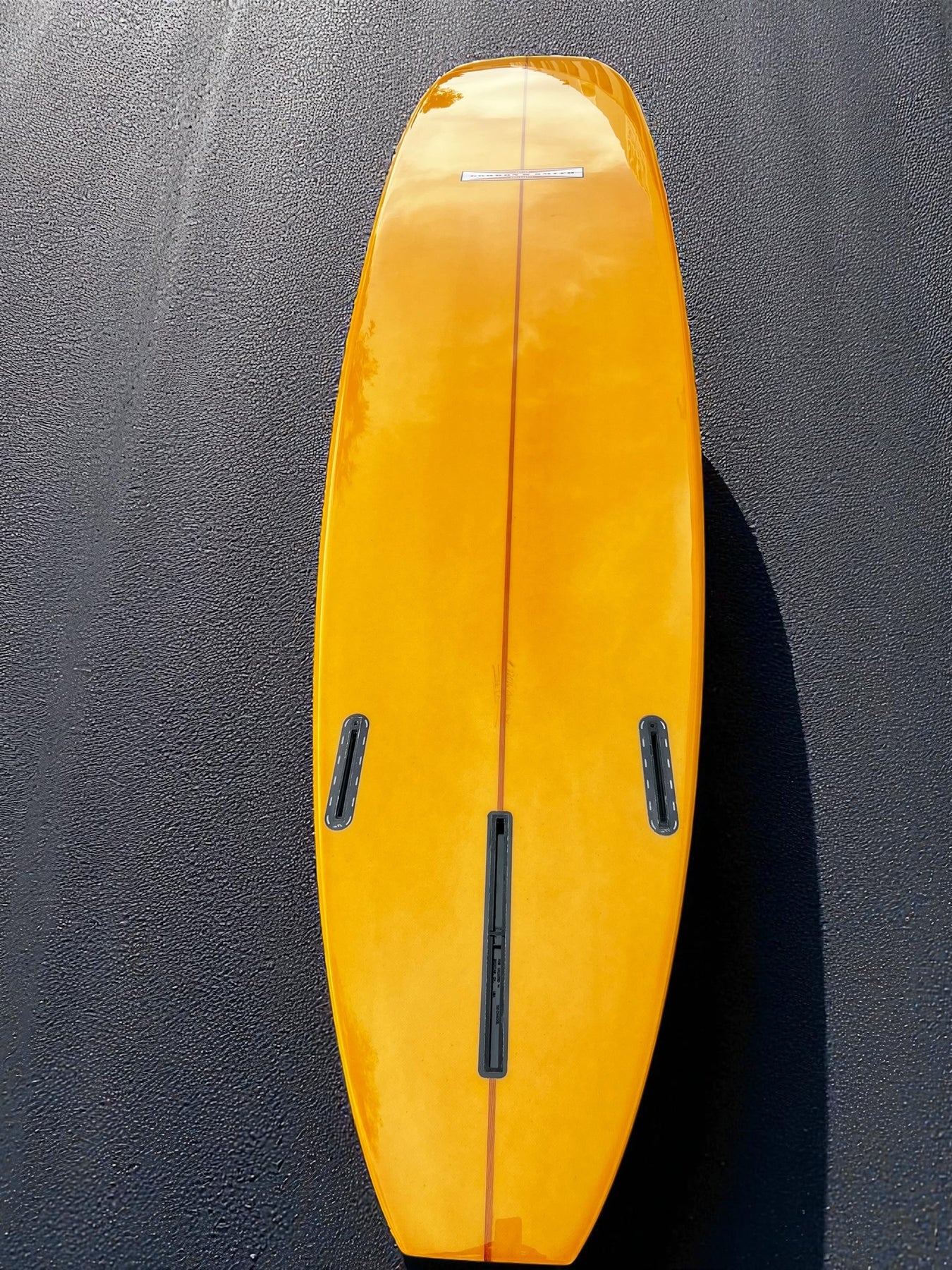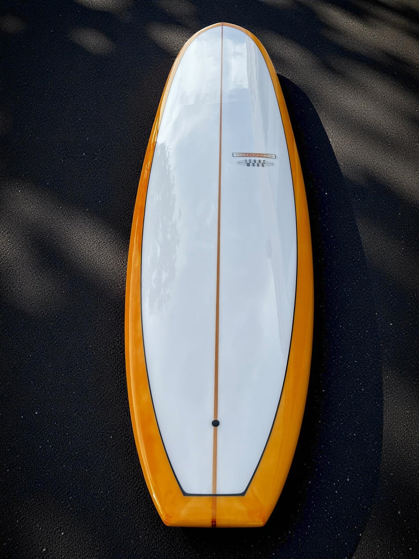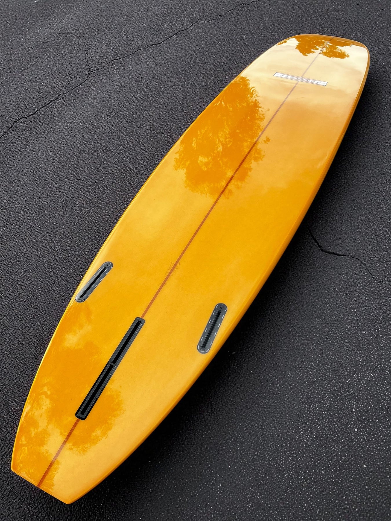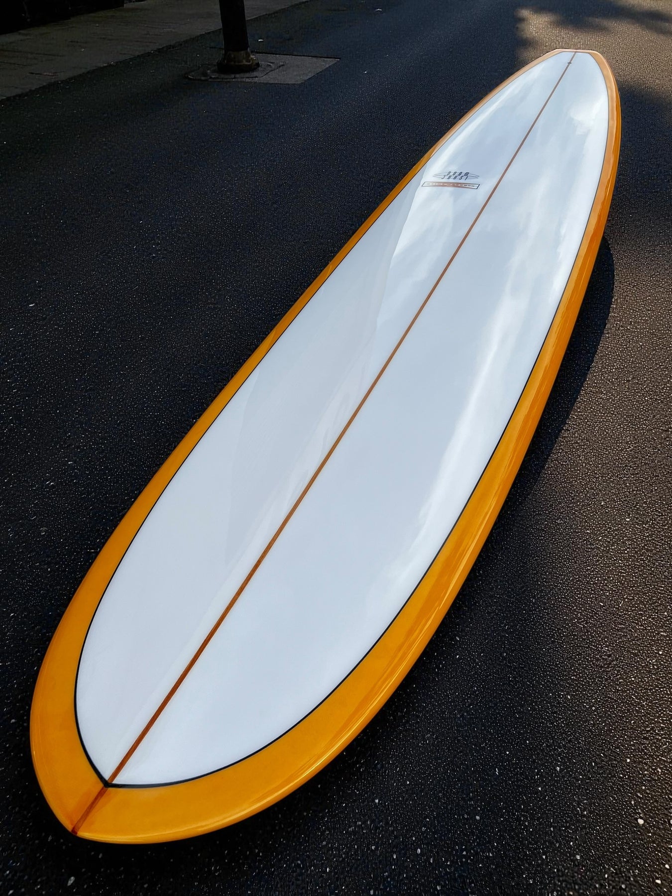 Tangerine Tint bottom &Rail with a black resin Pinline outline on deck. This board is glossed and polished finish.